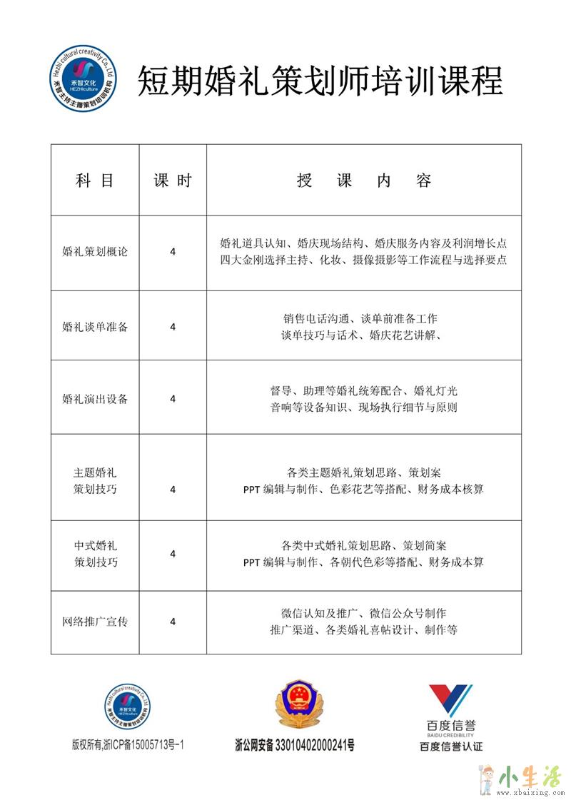 建立客户源等;培训内容:婚礼统筹,婚礼策划(色系与花艺的搭配,新人策划